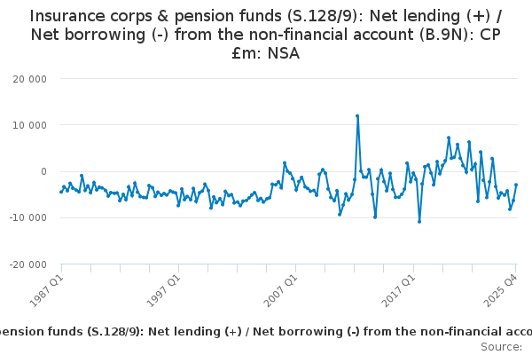 Download this time seriesInsurance corps & pension funds (S.128/9): Net lending (+) / Net borrowing (-) from the non-financial account (B.9N): CP £m: NSA