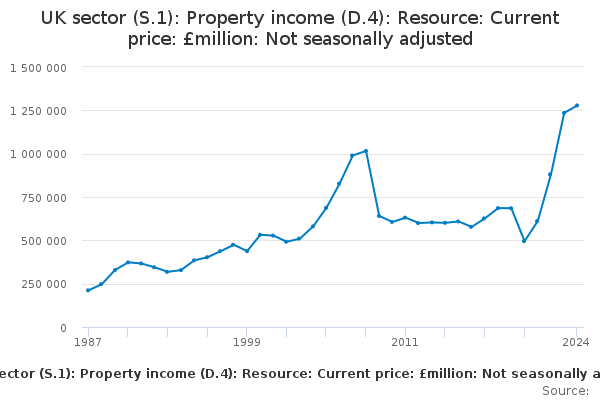 Download this time seriesUK sector (S.1): Property income (D.4): Resource: Current price: £million: Not seasonally adjusted