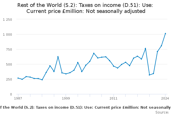Download this time seriesRest of the World (S.2): Taxes on income (D.51): Use: Current price £million: Not seasonally adjusted