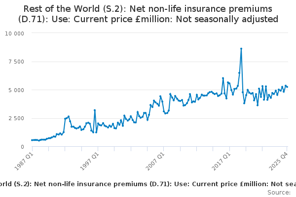 Download this time seriesRest of the World (S.2): Net non-life insurance premiums (D.71): Use: Current price £million: Not seasonally adjusted