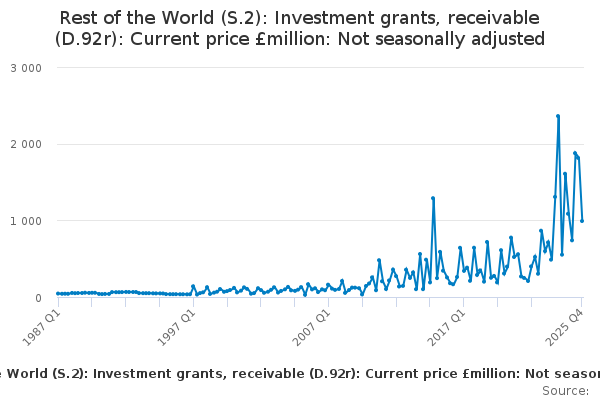 Download this time seriesRest of the World (S.2): Investment grants, receivable (D.92r): Current price £million: Not seasonally adjusted