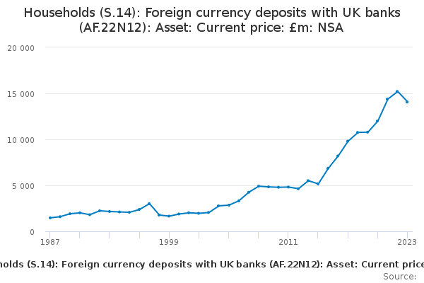 Download this time seriesHouseholds (S.14): Foreign currency deposits with UK banks (AF.22N12): Asset: Current price: £m: NSA