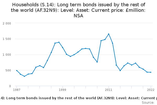 Download this time seriesHouseholds (S.14): Long term bonds issued by the rest of the world (AF.32N9): Level: Asset: Current price: £million: NSA