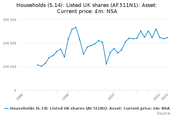Download this time seriesHouseholds (S.14): Listed UK shares (AF.511N1): Asset: Current price: £m: NSA