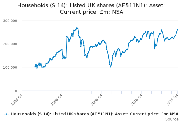 Download this time seriesHouseholds (S.14): Listed UK shares (AF.511N1): Asset: Current price: £m: NSA