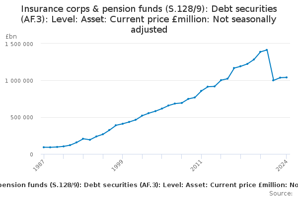 Download this time seriesInsurance corps & pension funds (S.128/9): Debt securities (AF.3): Level: Asset: Current price £million: Not seasonally adjusted