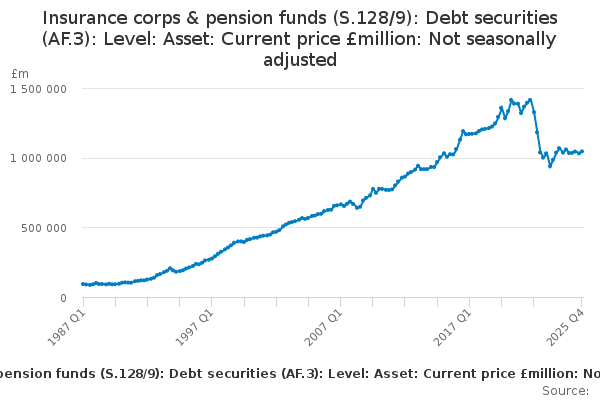 Download this time seriesInsurance corps & pension funds (S.128/9): Debt securities (AF.3): Level: Asset: Current price £million: Not seasonally adjusted