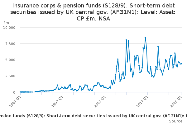 Download this time seriesInsurance corps & pension funds (S128/9): Short-term debt securities issued by UK central gov. (AF.31N1): Level: Asset: CP £m: NSA