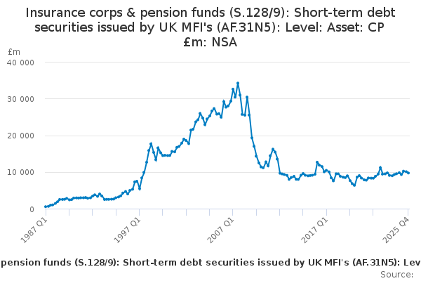 Download this time seriesInsurance corps & pension funds (S.128/9): Short-term debt securities issued by UK MFI's (AF.31N5): Level: Asset: CP £m: NSA