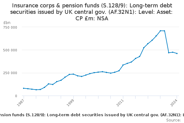 Download this time seriesInsurance corps & pension funds (S.128/9): Long-term debt securities issued by UK central gov. (AF.32N1): Level: Asset: CP £m: NSA
