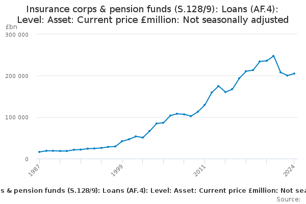 Download this time seriesInsurance corps & pension funds (S.128/9): Loans (AF.4): Level: Asset: Current price £million: Not seasonally adjusted