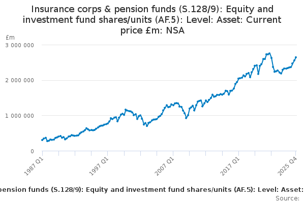 Download this time seriesInsurance corps & pension funds (S.128/9): Equity and investment fund shares/units (AF.5): Level: Asset: Current price £m: NSA