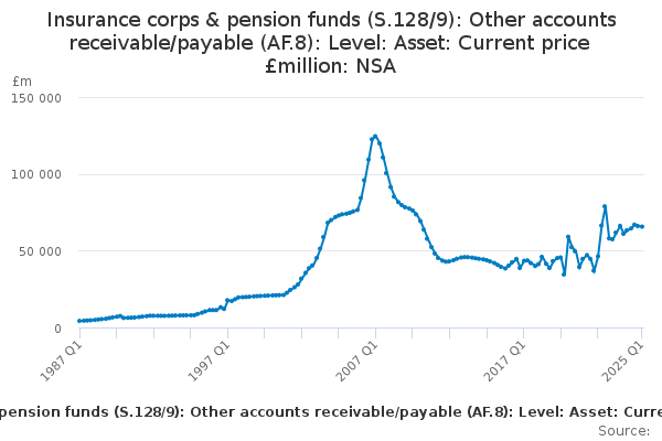 Download this time seriesInsurance corps & pension funds (S.128/9): Other accounts receivable/payable (AF.8): Level: Asset: Current price £million: NSA
