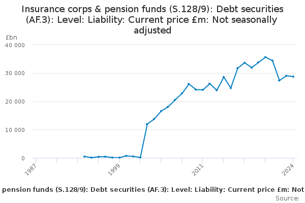 Download this time seriesInsurance corps & pension funds (S.128/9): Debt securities (AF.3): Level: Liability: Current price £m: Not seasonally adjusted