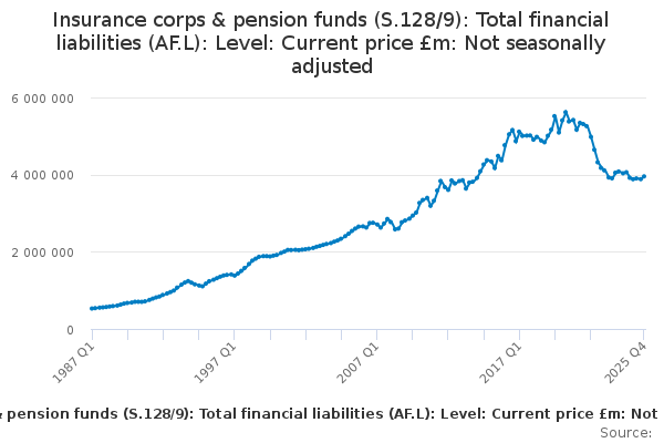 Download this time seriesInsurance corps & pension funds (S.128/9): Total financial liabilities (AF.L): Level: Current price £m: Not seasonally adjusted