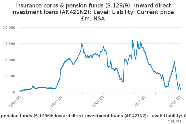 Download this time seriesInsurance corps & pension funds (S.128/9): Inward direct investment loans (AF.421N2): Level: Liability: Current price £m: NSA
