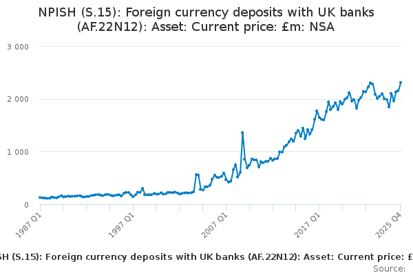 Download this time seriesNPISH (S.15): Foreign currency deposits with UK banks (AF.22N12): Asset: Current price: £m: NSA