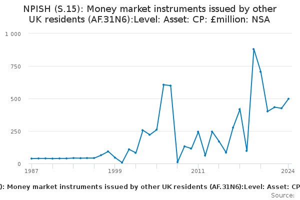 Download this time seriesNPISH (S.15): Money market instruments issued by other UK residents (AF.31N6):Level: Asset: CP: £million: NSA