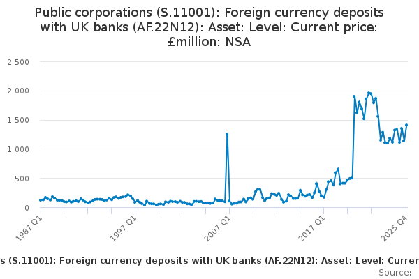 Download this time seriesPublic corporations (S.11001): Foreign currency deposits with UK banks (AF.22N12): Asset: Level: Current price: £million: NSA