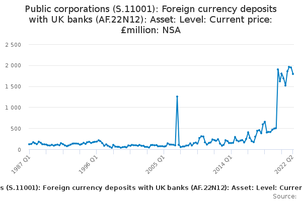 Download this time seriesPublic corporations (S.11001): Foreign currency deposits with UK banks (AF.22N12): Asset: Level: Current price: £million: NSA