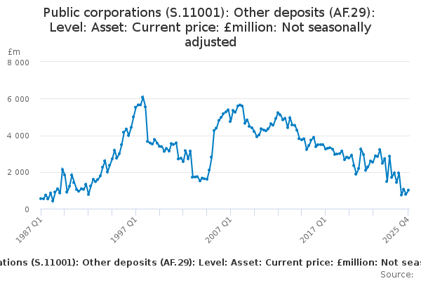 Download this time seriesPublic corporations (S.11001): Other deposits (AF.29): Level: Asset: Current price: £million: Not seasonally adjusted