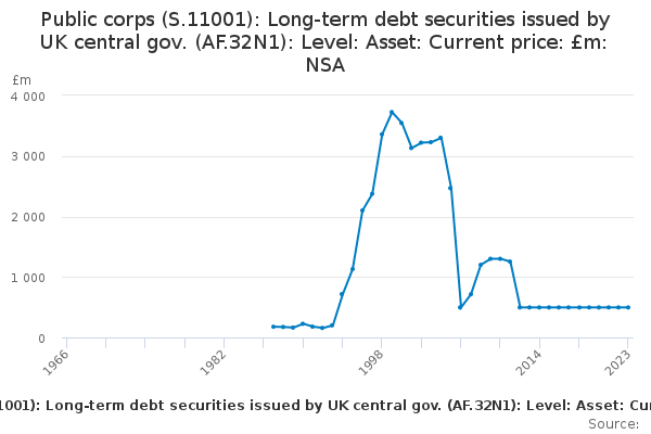 Download this time seriesPublic corps (S.11001): Long-term debt securities issued by UK central gov. (AF.32N1): Level: Asset: Current price: £m: NSA