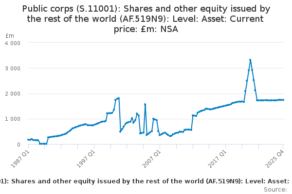 Download this time seriesPublic corps (S.11001): Shares and other equity issued by the rest of the world (AF.519N9): Level: Asset: Current price: £m: NSA