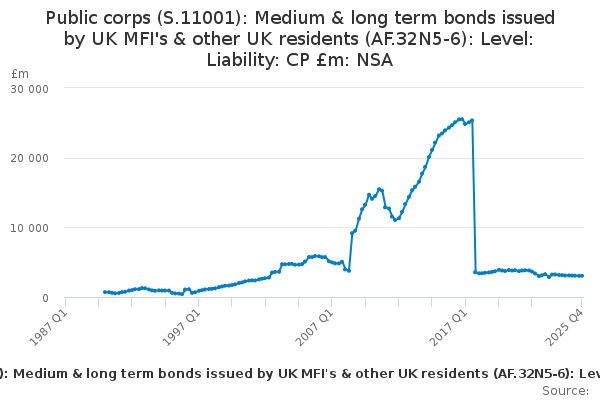 Download this time seriesPublic corps (S.11001): Medium & long term bonds issued by UK MFI's & other UK residents (AF.32N5-6): Level: Liability: CP £m: NSA
