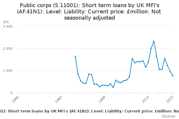 Download this time seriesPublic corps (S.11001): Short term loans by UK MFI's (AF.41N1): Level: Liability: Current price: £million: Not seasonally adjusted