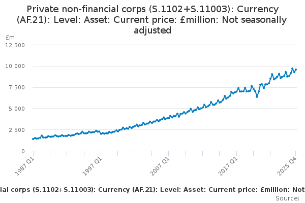 Download this time seriesPrivate non-financial corps (S.1102+S.11003): Currency (AF.21): Level: Asset: Current price: £million: Not seasonally adjusted