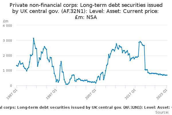 Download this time seriesPrivate non-financial corps: Long-term debt securities issued by UK central gov. (AF.32N1): Level: Asset: Current price: £m: NSA