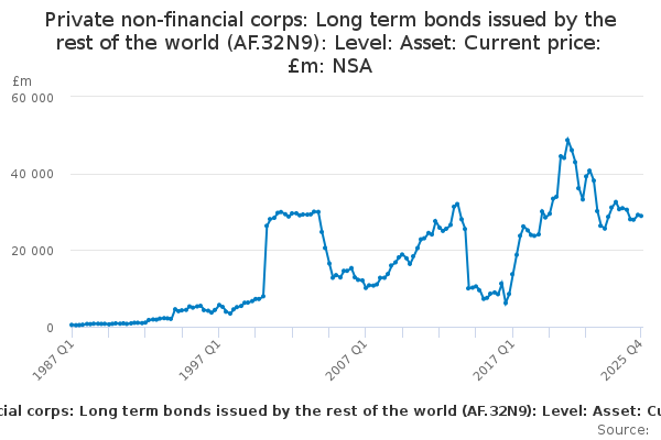 Download this time seriesPrivate non-financial corps: Long term bonds issued by the rest of the world (AF.32N9): Level: Asset: Current price: £m: NSA