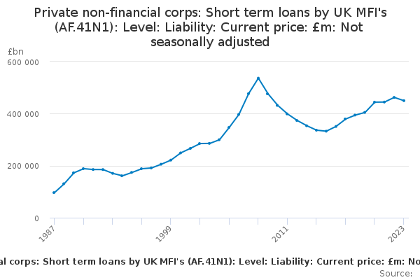 Download this time seriesPrivate non-financial corps: Short term loans by UK MFI's (AF.41N1): Level: Liability: Current price: £m: Not seasonally adjusted