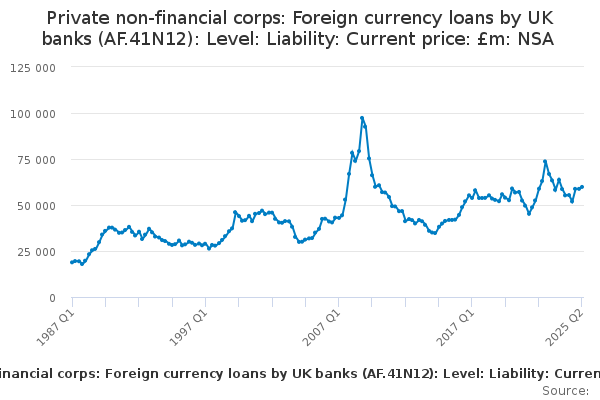 Download this time seriesPrivate non-financial corps: Foreign currency loans by UK banks (AF.41N12): Level: Liability: Current price: £m: NSA