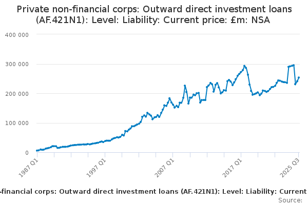 Download this time seriesPrivate non-financial corps: Outward direct investment loans (AF.421N1): Level: Liability: Current price: £m: NSA