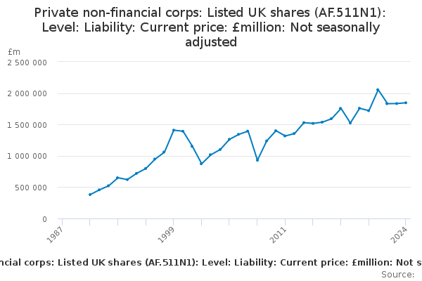Download this time seriesPrivate non-financial corps: Listed UK shares (AF.511N1): Level: Liability: Current price: £million: Not seasonally adjusted