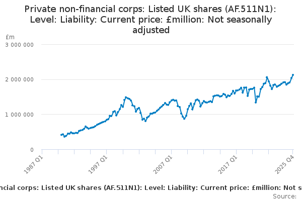 Download this time seriesPrivate non-financial corps: Listed UK shares (AF.511N1): Level: Liability: Current price: £million: Not seasonally adjusted