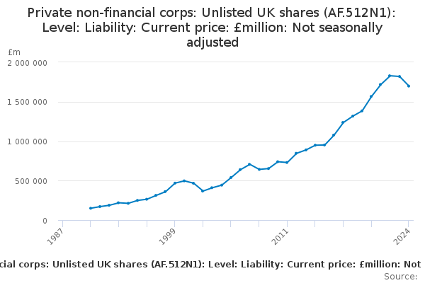 Download this time seriesPrivate non-financial corps: Unlisted UK shares (AF.512N1): Level: Liability: Current price: £million: Not seasonally adjusted