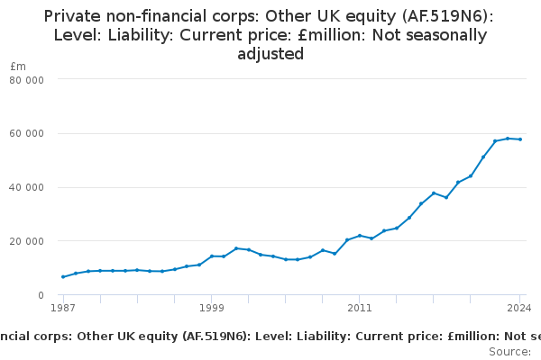 Download this time seriesPrivate non-financial corps: Other UK equity (AF.519N6): Level: Liability: Current price: £million: Not seasonally adjusted