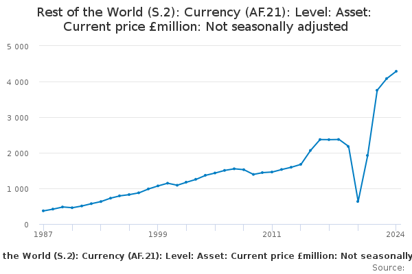 Download this time seriesRest of the World (S.2): Currency (AF.21): Level: Asset: Current price £million: Not seasonally adjusted