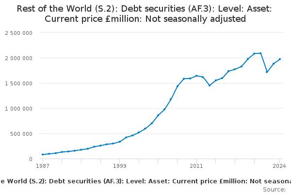 Download this time seriesRest of the World (S.2): Debt securities (AF.3): Level: Asset: Current price £million: Not seasonally adjusted