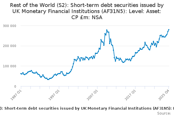Download this time seriesRest of the World (S2): Short-term debt securities issued by UK Monetary Financial Institutions (AF31N5): Level: Asset: CP £m: NSA
