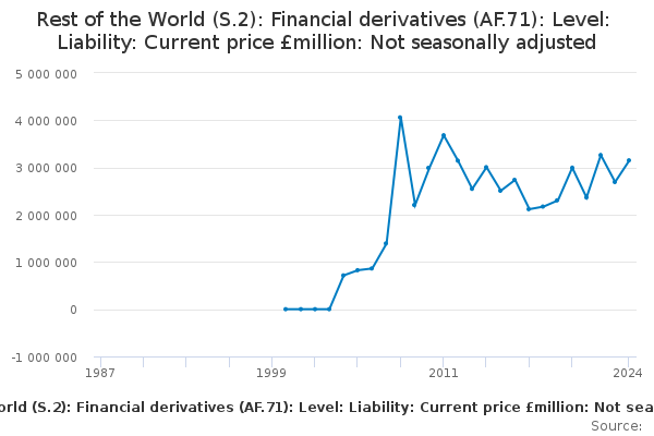Download this time seriesRest of the World (S.2): Financial derivatives (AF.71): Level: Liability: Current price £million: Not seasonally adjusted
