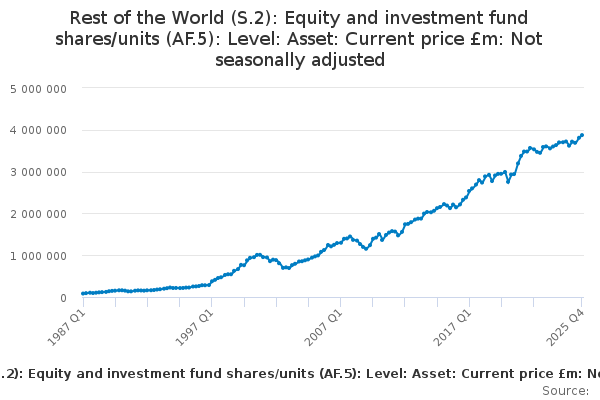 Download this time seriesRest of the World (S.2): Equity and investment fund shares/units (AF.5): Level: Asset: Current price £m: Not seasonally adjusted