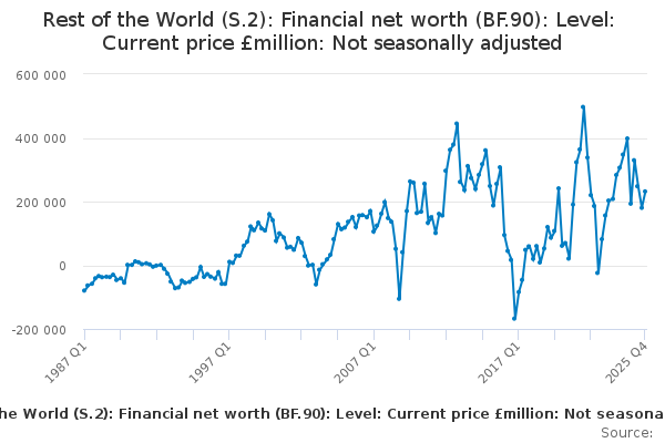 Download this time seriesRest of the World (S.2): Financial net worth (BF.90): Level: Current price £million: Not seasonally adjusted