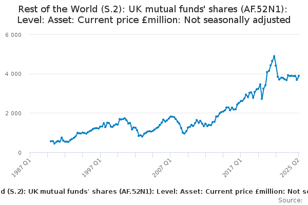 Download this time seriesRest of the World (S.2): UK mutual funds' shares (AF.52N1): Level: Asset: Current price £million: Not seasonally adjusted