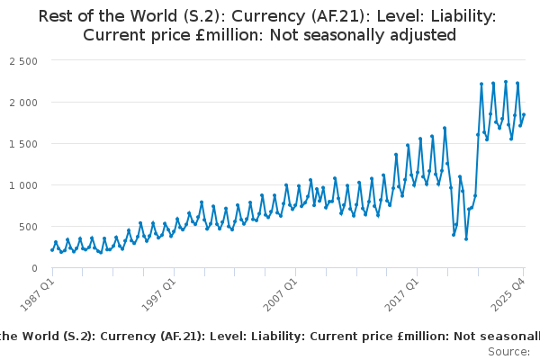 Download this time seriesRest of the World (S.2): Currency (AF.21): Level: Liability: Current price £million: Not seasonally adjusted