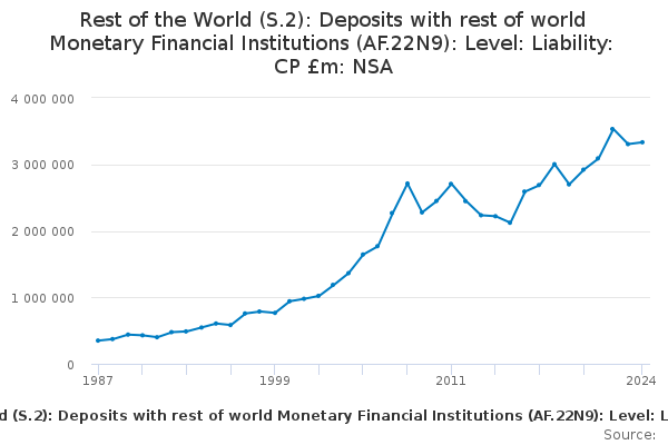 Download this time seriesRest of the World (S.2): Deposits with rest of world Monetary Financial Institutions (AF.22N9): Level: Liability: CP £m: NSA