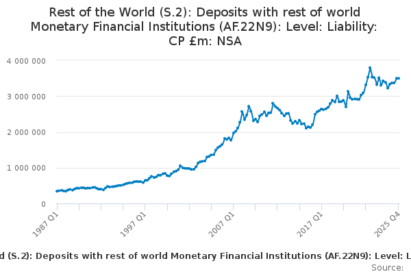 Download this time seriesRest of the World (S.2): Deposits with rest of world Monetary Financial Institutions (AF.22N9): Level: Liability: CP £m: NSA