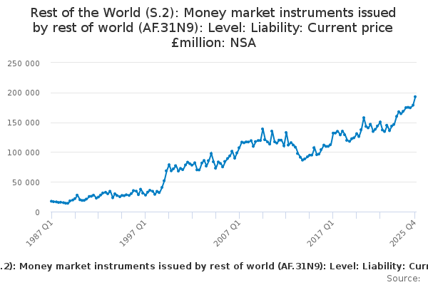 Download this time seriesRest of the World (S.2): Money market instruments issued by rest of world (AF.31N9): Level: Liability: Current price £million: NSA